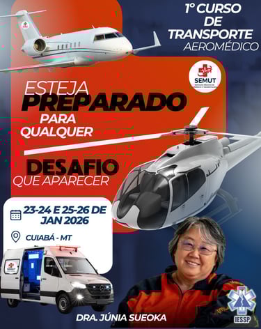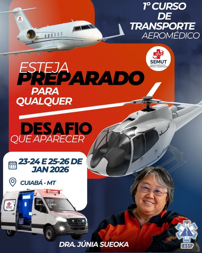 Se você é médico, enfermeiro, fisioterapeuta, piloto ou técnico de enfermagem, aluno (a) da área da saúde e busca ingressar ou se aprimorar no serviço aeromédico, este curso é para você. Nosso programa de 30 horas, será realizado em Cuiabá, capital do agronegócio em MT, garante treinamento intensivo com base nas normas da ANAC e do Ministério da Saúde. Aprenda com instrutores altamente qualificados e com vasta experiência operacional — Dra. Júnia Sueoka, Enf. Waine Ciampi e Ft. Ana Paula. O curso aborda desde legislação e segurança até o manejo de pacientes críticos, incluindo visita técnica a aeronaves.
